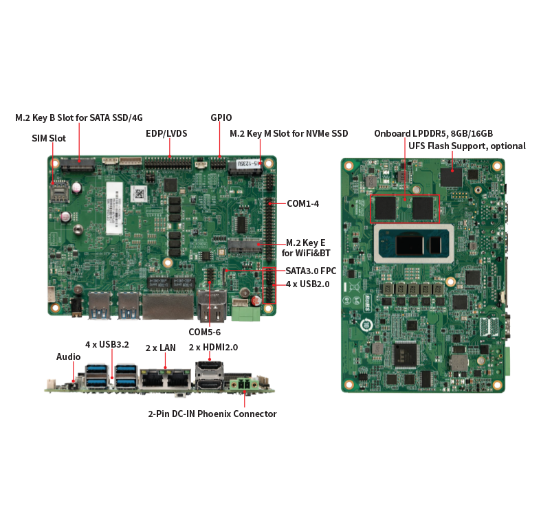 Storage: SATA3.0 FPC, M.2 Key B Slot for SATA/4G, M.2 Key M Slot for NVMe,UFS Flash optional
