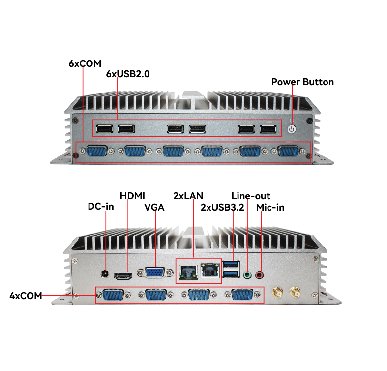 I/O Ports: 2xUSB3.2, 6xUSB2.0. 2xLAN, 10x COM