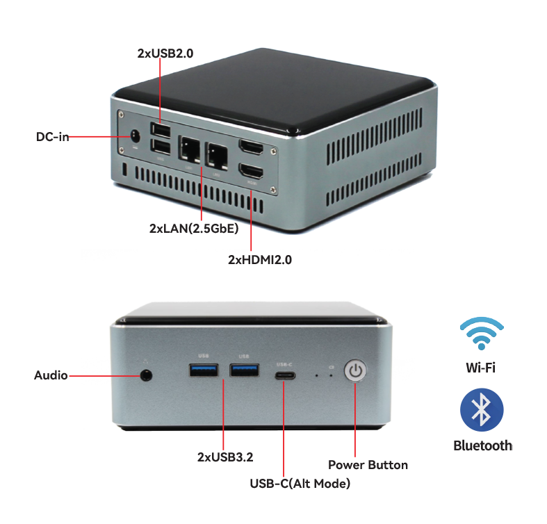 The Maxtang MTN-AL50 is a compact mini PC based on the 12th Gen Intel® Alder Lake-P Series proces-sors, which provides excellent performance with greater space-saving. Supports dual-channel SO-DIMM DDR5 up to 64GB, dual display via Intel® Iris® Xe Graphics through 2xHDMI®2.0. Features two 10/100/1000/2500 Mbps ethernet controllers, SATA3.0 and M.2 for storage, M.2 Key E for WiFi, and Bluetooth. A rich I/O interface includes 2xUSB3.2, 2xUSB2.0, 2xLAN, 1xUSB-C, Mic-in and Line-out in one with standard 19V/20V DC-in caters to most markets' requirements.