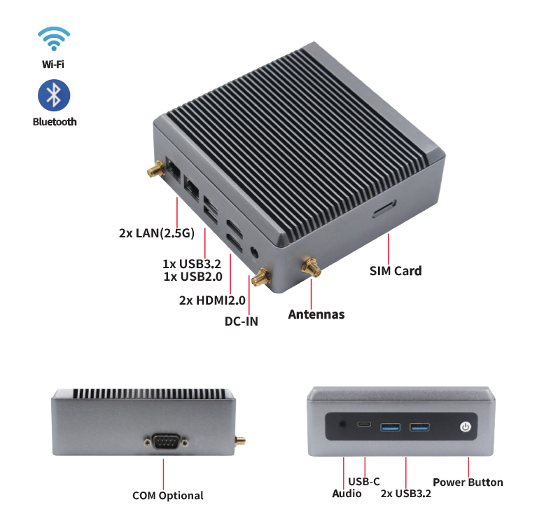 The Maxtang NX-N100 is powered by the Intel® Alder Lake-N processor, delivering efficient performance with cost advantages in an ultra-compact, fanless form factor (127 × 127 × 45.6 mm). It supports up to 32GB single-channel DDR4, multiple displays via dual HDMI® 2.0 and USB-C DisplayPort 1.4, and flexible expansion with M.2 storage, FPC SATA, built-in Wi-Fi/Bluetooth, and a SIM slot. Rich I/O includes dual LAN (up to 2.5GbE), 3 × USB 3.2, and 1 × USB 2.0, meeting diverse connectivity needs.