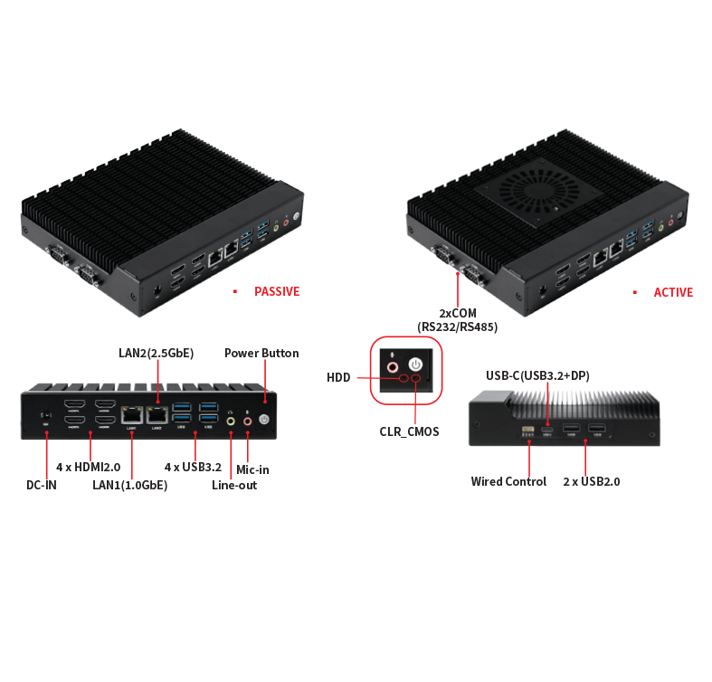 I/O Ports: 2xLAN, 2xCOM, 4xUSB3.2, 2xUSB2.0, 4xHDMI, USB-C