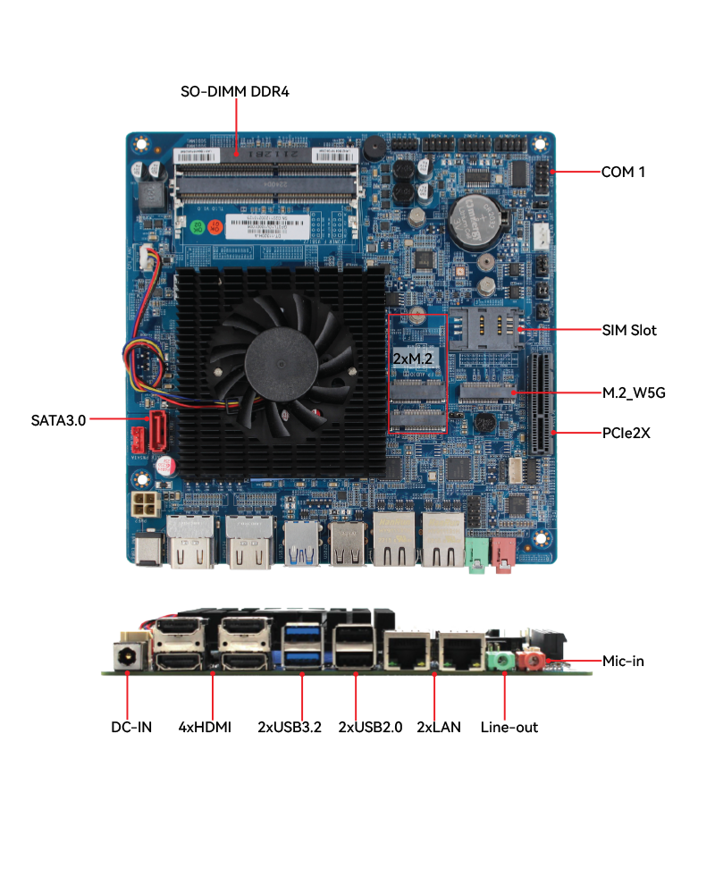 The TL10 Mini ITX motherboard is based on the 11th Gen Intel® Core i7/i5/i3/Celeron® processor (Code Name: Tiger Lake-U), provides a complete PC platform with excellent performance. The board supports 4xHDMI2.0 displays in addition to dual-channel SO-DIMM DDR4 memory, features two Gigabit Ethernet controllers, 3x M.2 for expansion.